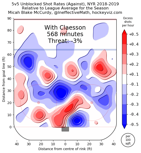 I love these shot heatmaps because it shows how effective any player is, and in Claesson’s case, these heatmaps for shots against show how good he was. He did so with noted black hole Neal Pionk as his primary defense partner (61 minutes). He also spent significant time with Tony DeAngelo (53 minutes). For reference sake, Claesson had 568 minutes of even strength time, and Pionk/DeAngelo were his two most common partners. Suffice it to say, he was bounced around the lineup a lot.