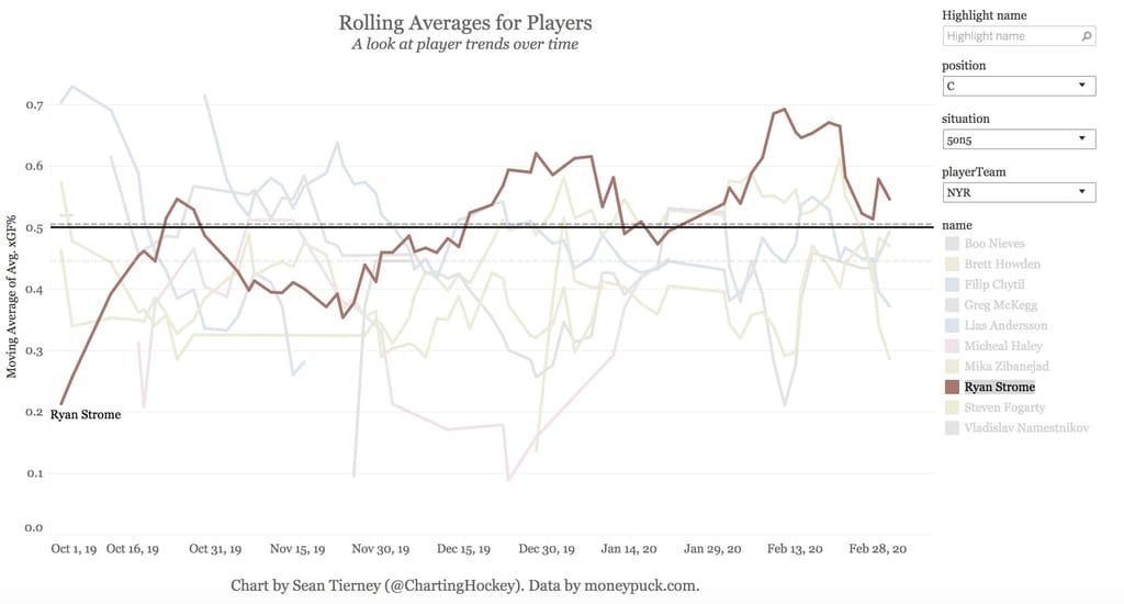 Taking this a little deeper and looking at his rolling xGF%, we see that Strome was still an overall positive impact on the ice.