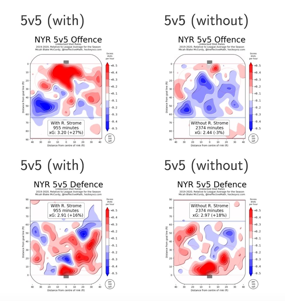That said, we still need to get the full picture of Strome’s impact on the ice. Offensively, to no one’s surprise, the Rangers flourished with him on the ice. This was a very top-heavy Rangers team, so all of the top-six have offensively numbers like this. The defensive numbers aren’t pretty, again as expected, but the Rangers were still overall better with Strome on the ice. The offensive impact heavily outweighed the defensive impact.
