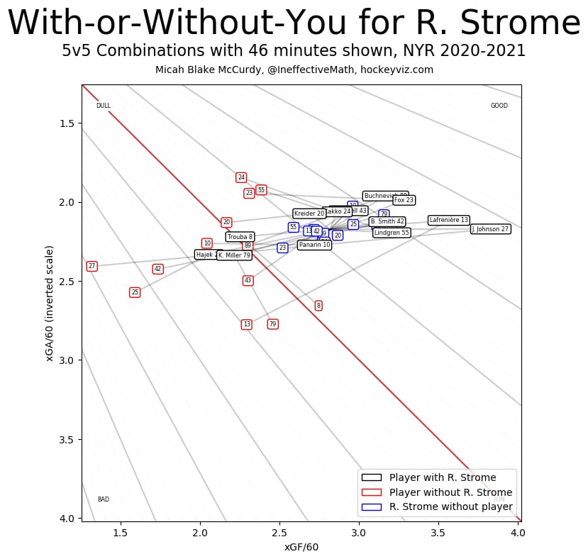 WOWY’s are a little noisy, but what this shows is Strome generally sits where all the lines originate. What we want to focus on are the blue boxes, which are also around the same area. This shows Strome produces with whomever he plays with. Another key are the red boxes, which are almost all to the left of Strome. This indicates that players are generally performing worse without Strome than with him.