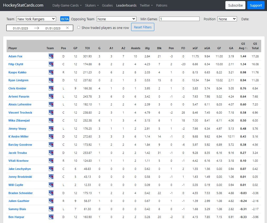 To wrap things up, I wanted to share the Rangers Game Score leaderboard from Janury to get a sense of who has been effective lately, and to drive home that the Rangers are fine. The Kid Line, despite not being able to recreate it earlier this year, has looked good and the number support that. I’m not thrilled to see Zibanejad where he’s at, but the decision to move Panarin on his left in place of Kreider is just a reminder that the duo have never been able to consistently drive play together. Also, Vinny Trocheck has continued to be consistently above average despite having one of this worst shooting % years of his career.