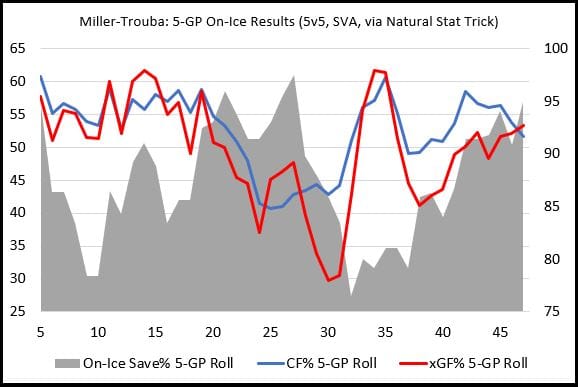 Unlike Harpur, Miller-Trouba as a pair has seen sub-0.890 (!!!) goaltending at 5v5 for the season, and as you can see above it was only recently did that start to positively regress again after it didn’t stick 20 games ago. While I’m not dismissing the up and down play of the pair (with Trouba being more the focus there), with a return to even just a normally-low PDO (shot % + save %) the pair would seem to be in much better shape – just like it’s felt lately.