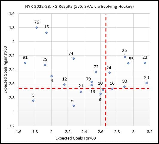 While we know the team is controlling shot share fairly well lately, the on-ice expected goal results by player tells a more accurate story of their impact. Again, only a few players consistently are on ice while the Rangers are generating quality offense at 5v5. Given that both Drury and Gallant are seemingly dead set on having a low event 3rd pair & 4th line, the depth ends up looking pretty paltry here.