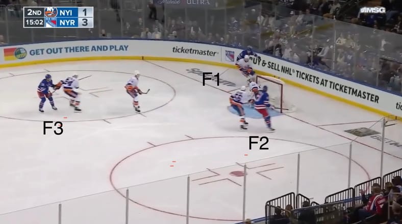 Here’s a perfect example of the 2-1-2 executed in a preseason game against the Islanders at MSG last week. In the second period, you have F1 & F2 hunting down low after a dump in. F3 is in the high slot reading and reacting to the situation and can either turn and back check or beeline for the blue paint.