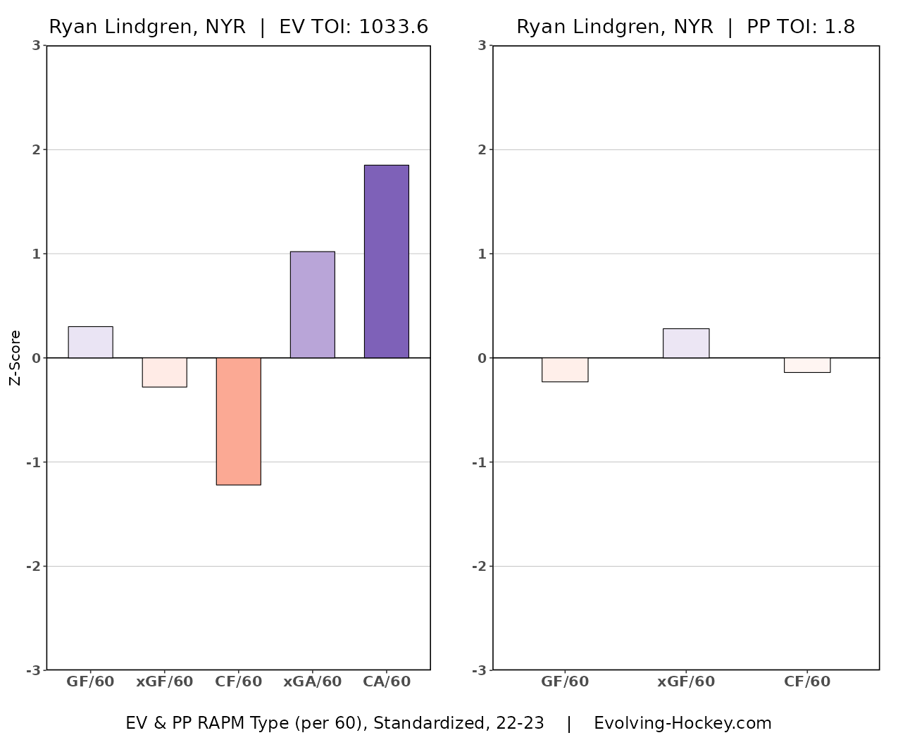 As Luker points out, the Rangers have a noticeable jump in shots/attempts for when neither Trouba nor Lindgren are on the ice. Since both are defense-first players, this makes sense, but the stark contrast is alarming. You normally don’t see a 20% difference like this.