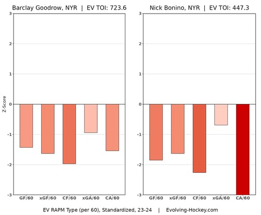 It’s hard to ignore how bad Goodrow has been, and whether his jaw has had an impact on his play. A chart doesn’t tell a whole story, especially when comparing Goodrow to Nick Bonino, who was pretty bad with the Rangers. This is the only real comparison to make right now since Goodrow’s performance has been so bad that Bonino is the only true comp to make.