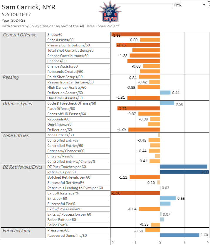 Isolating the defensive numbers, Carrick’s shutdown game was strong last season. Given the absolute train wreck of a team that was the Rangers in their own zone, Carrick was strong in his own zone while excelling in retrieving dump ins and quickly turning the play up the ice with successful zone exits. For a team that played Hot Potato with the puck, Carrick was surprisingly calm and consistent.