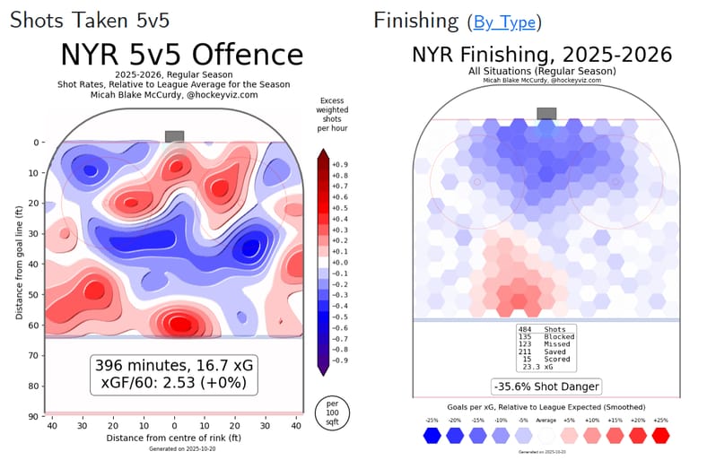 Team shot locations aren’t too bad, but that sea of blue in the medium danger areas at the tops of the circles and high slot are a bit alarming. In theory, the Rangers are generating decent chances at the net mouth, and if you combine this with being snakebitten, then there’s cause for optimism. The Rangers scoring woes, in this scenario, would largely be tied to the shooting percentage. Unfortunately, there’s more to it.