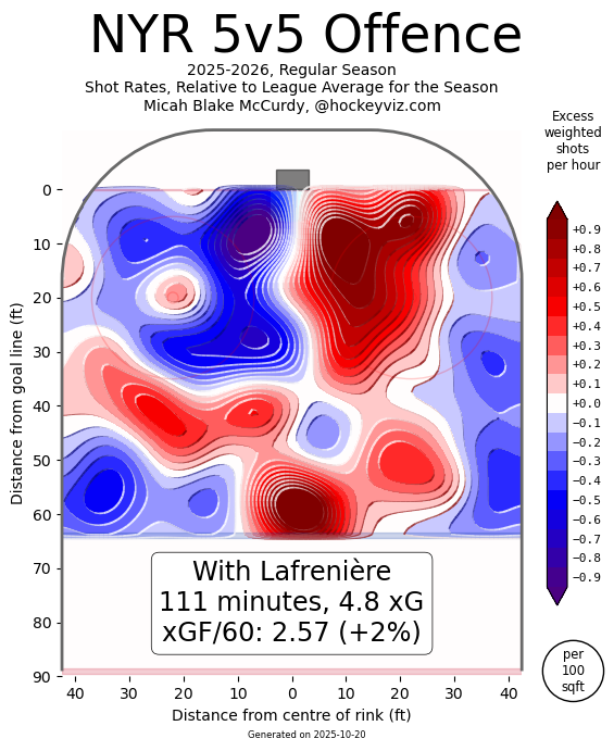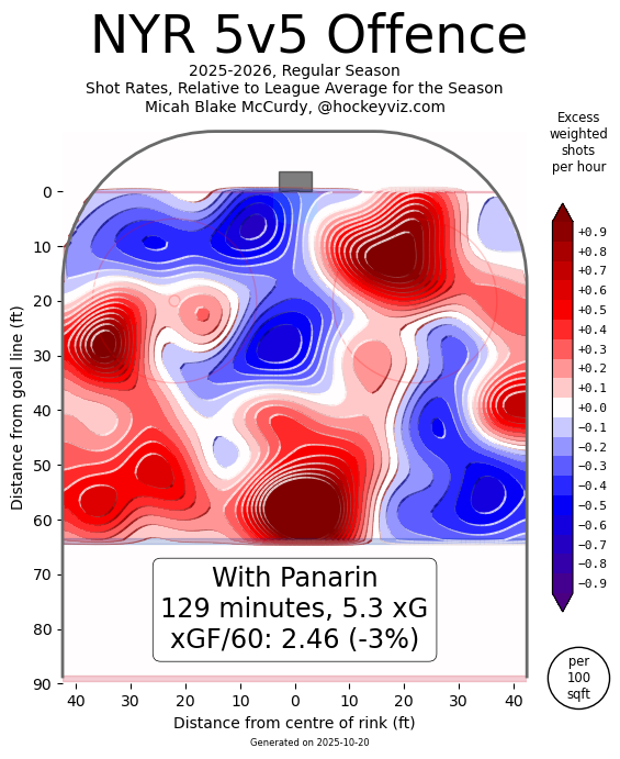 As a team, the Rangers scoring woes are pretty clearly focused on finishing in the high danger areas. The right most chart from Hockeyviz highlights this, as the Rangers are well below league average in finishing from the front of the net. They have 15 goals on a 23.3 xG this season (all situations), with their “hot” finishing coming from the mid-point. Not an ideal scenario.