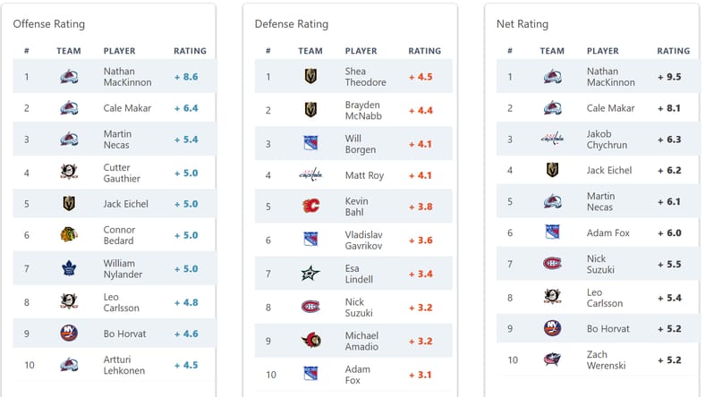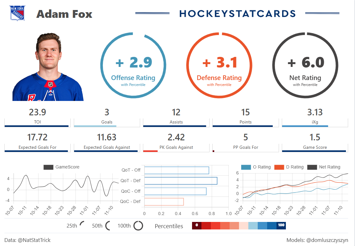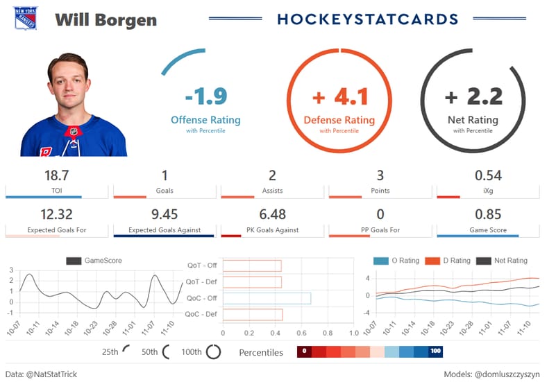 To summarize: Borgen has been getting the same quality of competition as both Gavrikov and Fox, gets far worse teammates, and starts shifts significantly more often in the defensive zone. While both Gavrikov and Fox grade out higher, per Hockey Stat Cards, because they also supplement their defense with offense, but Borgen carries the highest defense rating of the three.