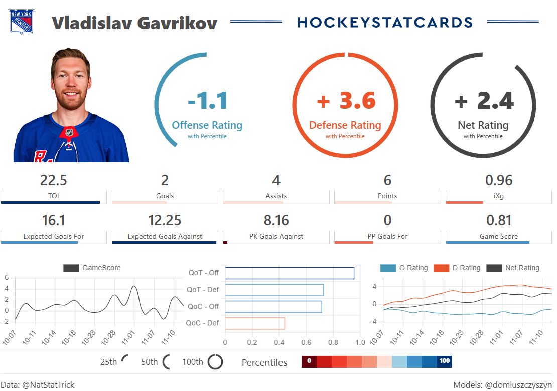 There’s a lot working against Borgen, but he’s doing great regardless and has cemented himself as one of the top three Rangers defensemen early in the season. Gavrikov/Fox are also receiving roughly 56% offensive zone starts, with Borgen getting just 40.63%.