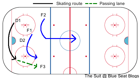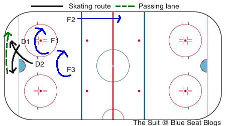 It’s a small adjustment, bringing the forwards in more, but it helps with giving the defense more support to skate the puck up and make a better, crisper first pass.