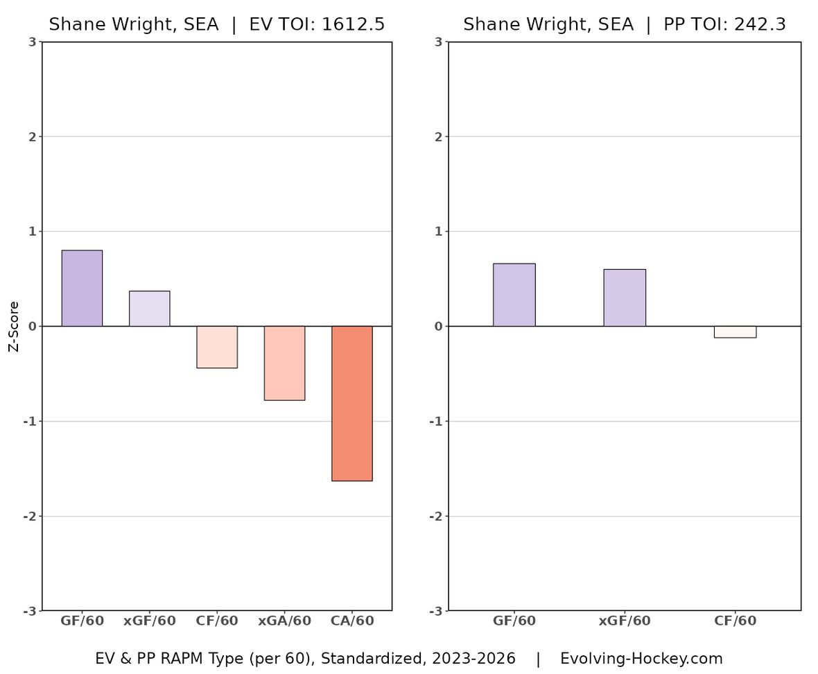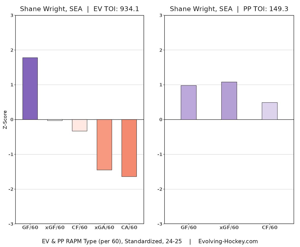 While he may be the perfect Rangers trade target, Wright isn’t without his risks. He’s struggled defensively in Seattle, a team that hasn’t really been good defensively anyway. There’s also a strong argument that he’s not a play driver on offense, but over three years (left most chart) and this season (right most chart) he’s been fine enough and better than most Rangers forwards right now.