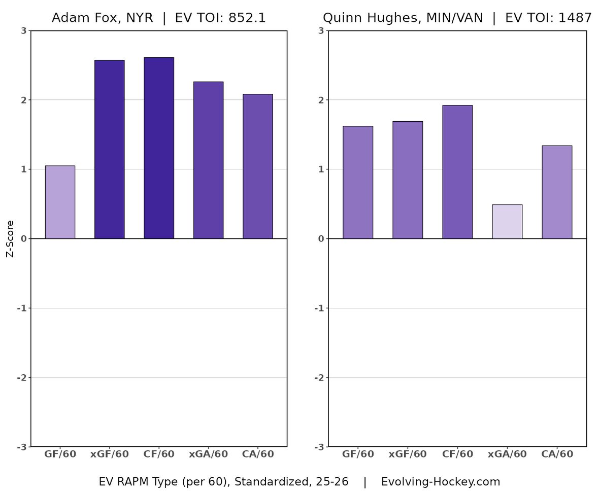 The Adam Fox slander usually ends with something along the lines of “Fox isn’t nearly as good as (player X).” The most commonly named players are Hughes, Makar, Faber, Victor Hedman, Zach Werenski, and Charlie McAvoy. I’ve seen Jake Sanderson and Jackson Lacombe mentioned as well.